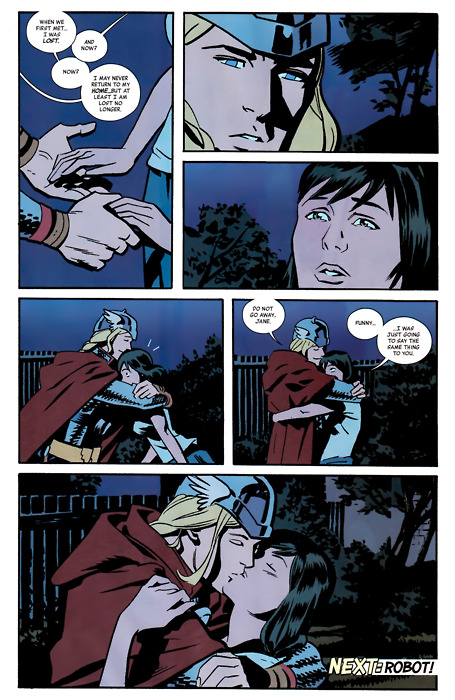 Jane is clearly taken by Thor from the beginning, Thor is ever the gentleman, and their romance builds slowly and sweetly over the eight issues of the series. I hesitate to spoil much, but the final page from issue #6 (in the second digest) is quite representative: