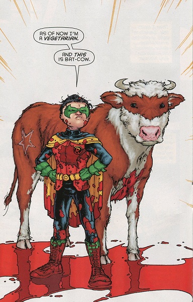 We start with an intensely bloody fight in a meat-processing plant; those with sensitive stomachs, look away. (Let's just say it's fitting that I'm listening to the new Cattle Decapitation album while writing this post.) Damian, of all people, sees the symbolism of this, and in the process christens the latest addition to the Bat-family, in a panel that I'm certain is destined to become a classic.