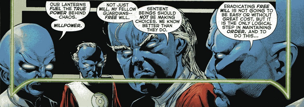 As you may have seen from the preview, the Smurfs Gone Wild have decided that the threat to the universe lies not in emotion in general, nor in individual emotions, but in the very willpower that powers the Green Lantern rings–or, as they put it, free will.
