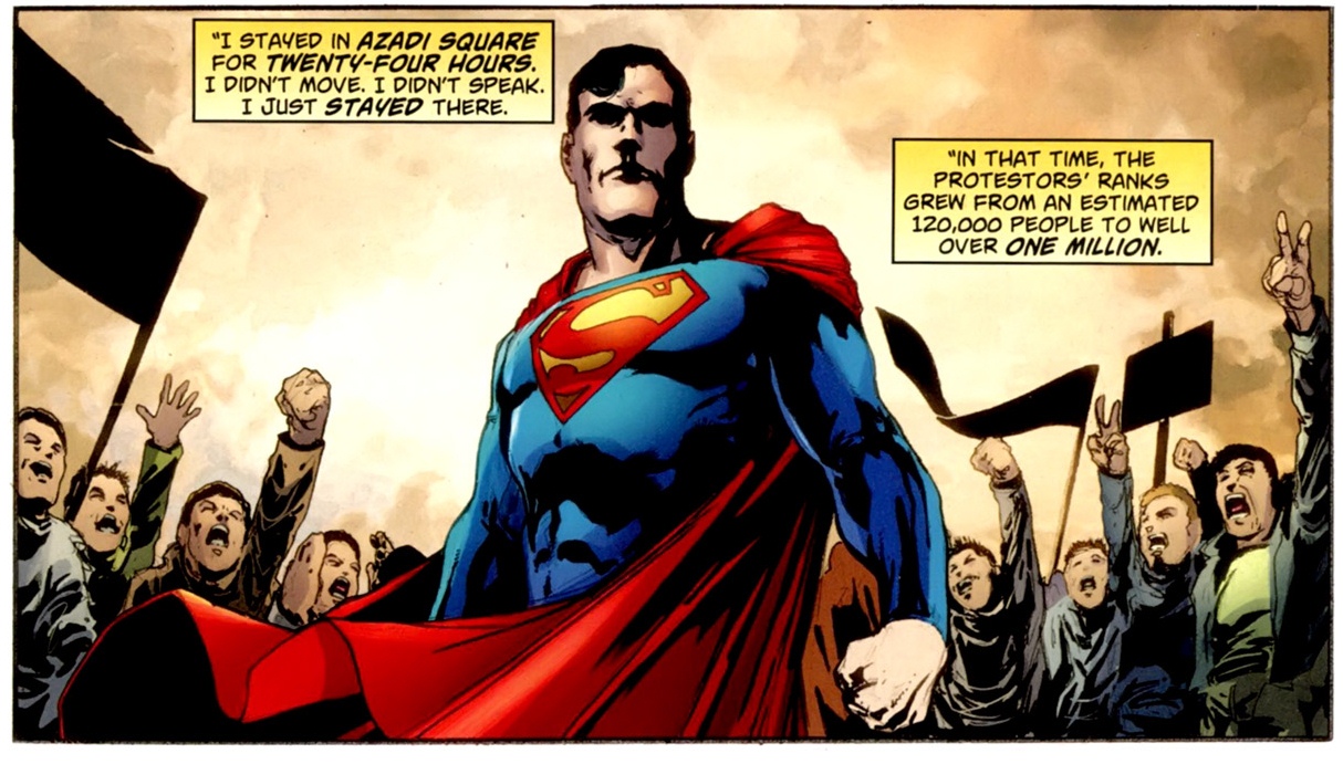 Not only is this an inspirational picture, it strongly evokes David S. Goyer's story from Action Comics #900 in which Superman intervenes in an Arab Spring-like protest by simply standing amongst the protestors in solidarity: