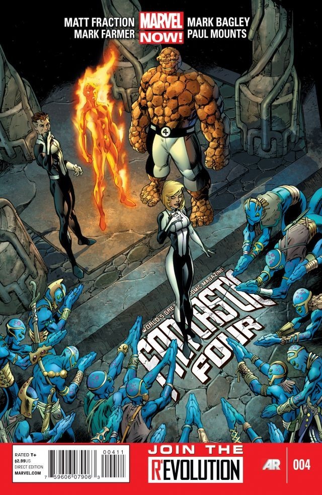 (The text boxes reflect Reed's inner monologue, which connects the present day with the flashbacks.) The planetary governor of Ayleth, Drea, expains that they rever the painting because it provides hope that there may be friends on other worlds, and when the Four arrive on their planet, they treat Sue in particular with near-religious fervor (as indicated on the cover above).