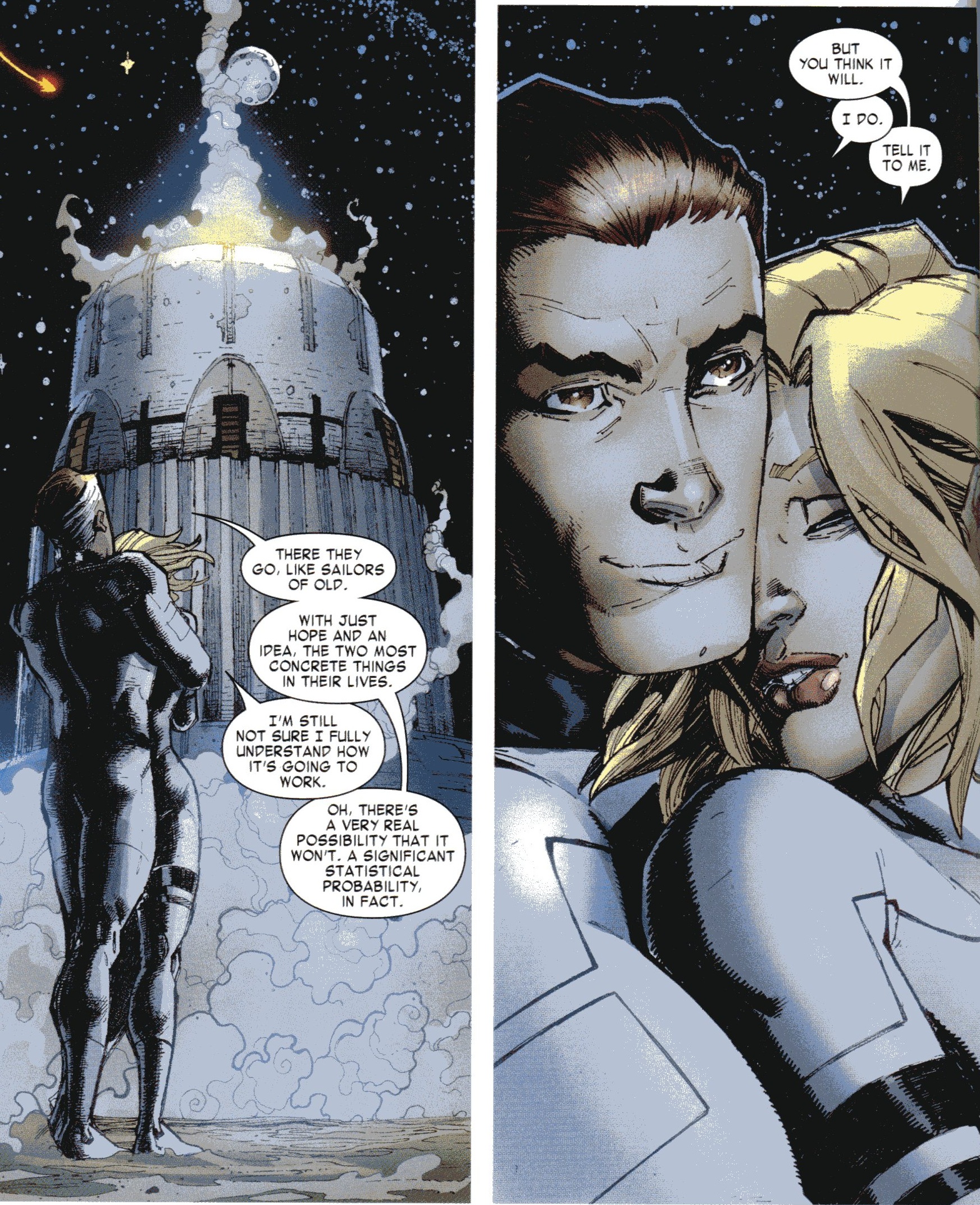 Leave it to Reed to ditch the flowers and candies for a truly unique Valentine's Day gift, one that inspires an entire planet to see Sue as he does. This issue also shows how everybody expresses love in his or her own way–and should be able to count on the right person to appreciate it. We'll finish with a tender scene from last year's Fantastic Four #609 by Jonathan Hickman and Ryan Stegman, which reminds us that Sue adores Reed for his giant brain and his heart.