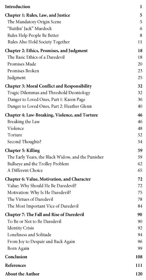 In this book, philosopher Mark D. White explores the moral character and behavior of Daredevil, one of the most intriguing and dramatic characters in superhero comics. Focusing on his earliest stories, from 1964’s Daredevil #1 to 1986’s “Born Again” storyline, we’ll ask who Matt Murdock is and why he does the things he does, in terms of both motivation and the basic character traits that influence his choices. We’ll examine Matt’s belief in the importance of rules, the role of promises in his life, and his sense of responsibility, each of which he tends to take farther than he should. We’ll discuss how he balances his personal devotion to the law with his nocturnal activities, and we’ll follow him as he becomes more violent, crossing the line into torture, but avoiding killing (for the most part). Most generally, we’ll watch as he gradually starts to come apart at the seams, the roots of which appear early on but intensify as the years go on, reaching a climax as his life is completely dismantled in “Born Again” with the help of one of his greatest foes—and one of his closest friends.